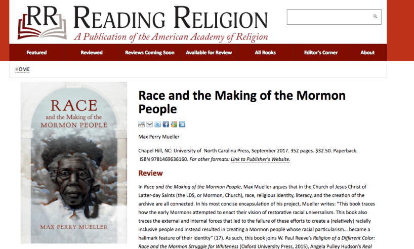 My friend and colleague Ben Park reviewed Race and the Making of the Mormon People at the Junto blog on early American history. (Ben's new book, American Nationalisms: Imagining Union in an Age of Revolutions, looks very promising). Though I'm both a historian and a "religious studies scholar," that's the end of my quibbling with Ben's thoughtful review! Relatedly, [...]